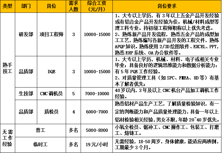 公司擁有廣東省唯一的鋁車體工程技術(shù)研究中心!扳伱冷X材”品牌先后獲得鋁型材行業(yè)內(nèi)的最高榮譽(yù):“中國(guó)馳名商標(biāo)”、“中國(guó)著名品牌”、“中國(guó)名優(yōu)產(chǎn)品”;公司榮獲“國(guó)家高新技術(shù)企業(yè)”、廣東省“專精特新”企業(yè)等榮譽(yù)稱號(hào)。因生產(chǎn)發(fā)展需要,誠(chéng)聘以下崗位: